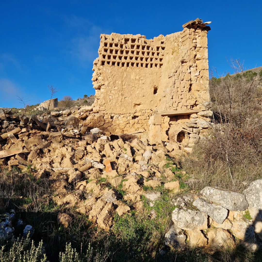 Descripción: Se trata de un corral cercado con un muro bajo, donde también estaba añadido un palomar, observamos que en su parte más baja del palomar, en el frente mirando al sur, tenía incrustados algunos Dujos, que a medida que se ha ido derrumbando el palomar, se han ido perdiendo, posiblemente el cercado, a su vez tendría Dujos verticales en el frente, completando este corral con estos usos.