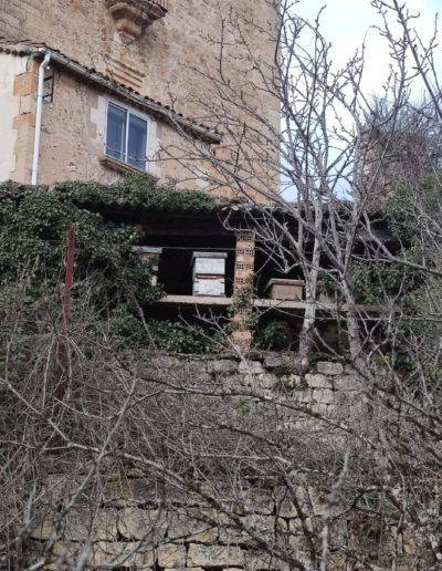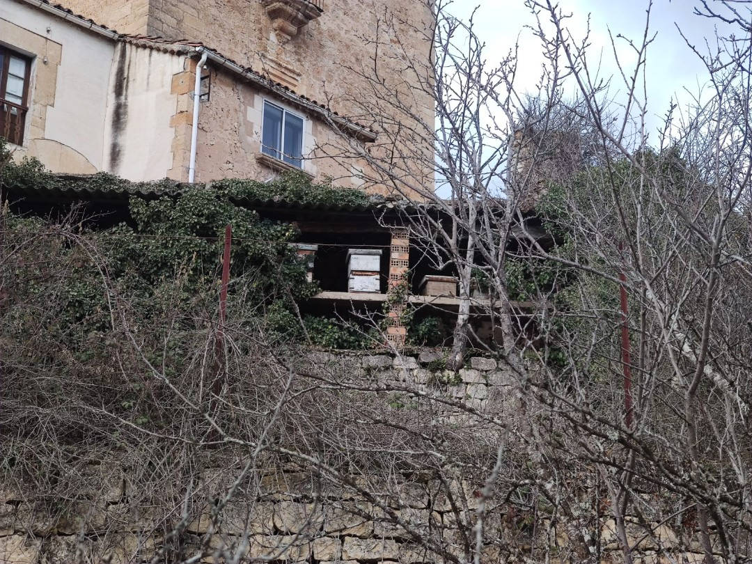 Descripción: Aunque no me he podido acercar del todo, observo, que una de las construcciones y terrenos más importantes de esta localidad contiene, dentro de uno de los terrenos propios, un colmenar claramente visible y que seguramente se ha mantenido en el tiempo, aunque se le ve que ha tenido cambios, ya que actualmente lo que tiene son algunas colmenas modernas, algo de ladrillo y un techo de chapa, el lugar ha tenido que ser un colmenar tradicional en el tiempo.
