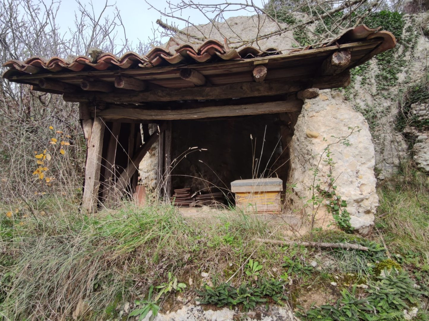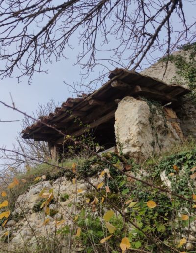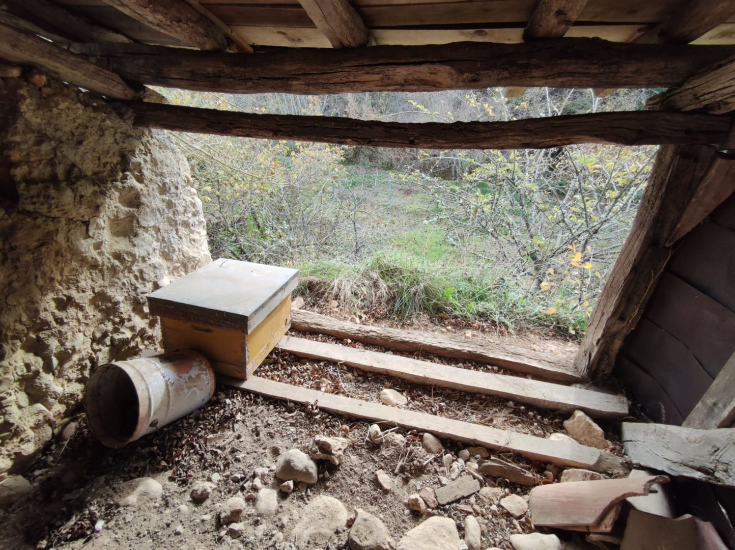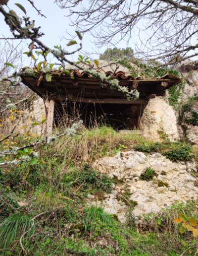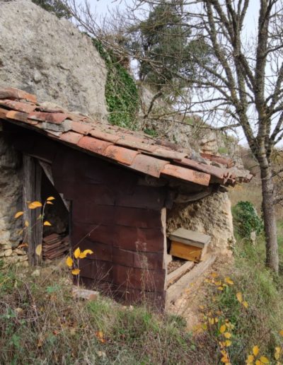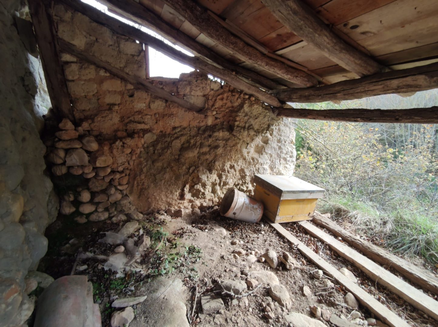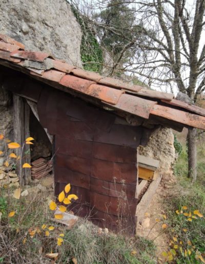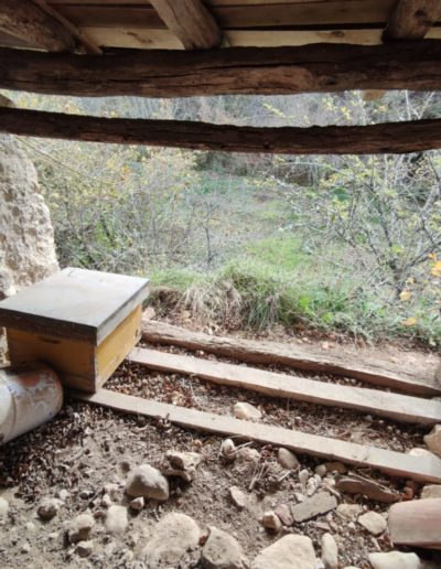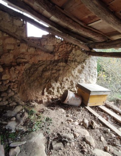 Descripción: Se trata de una construcción diseñada y realizada para albergar colmenas, en una huerta con frutales y en la zona más elevada de la misma, pegada a la roca, se ha generado un pequeño espacio para colmenas que ha podido ir variando en su uso, aunque solo encontramos una colmena moderna,ha podido albergar Dujos tanto de pie como tumbados, aunque por la situación y amplitud del mismo en su interior y una pequeña zona aledaña a la misma construcción con ese fin.