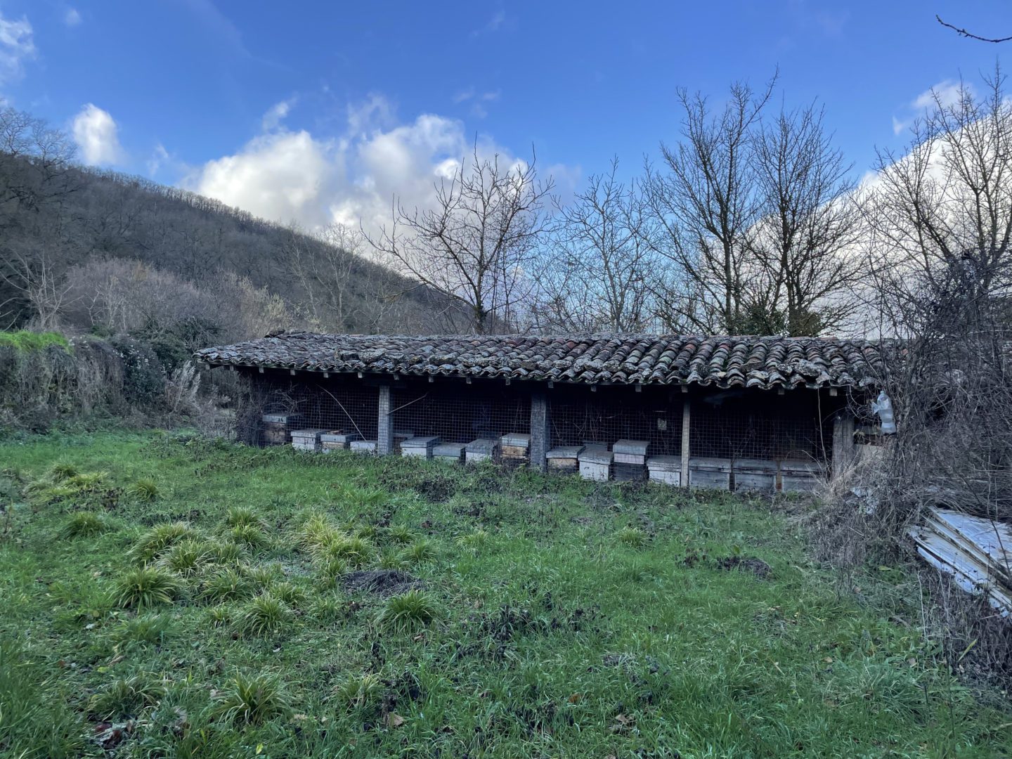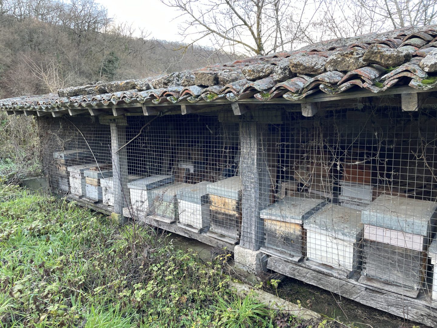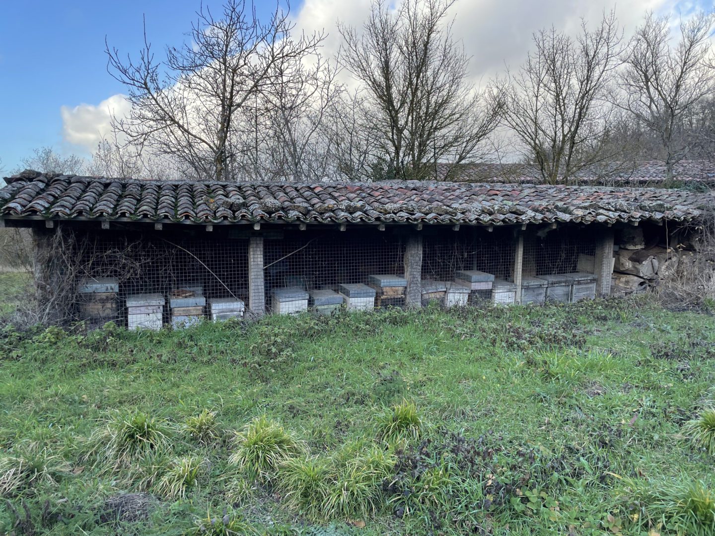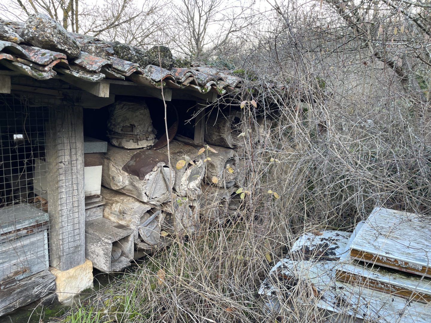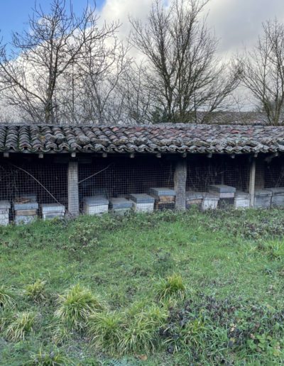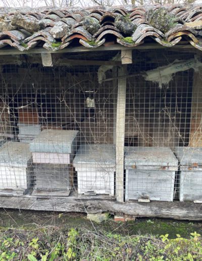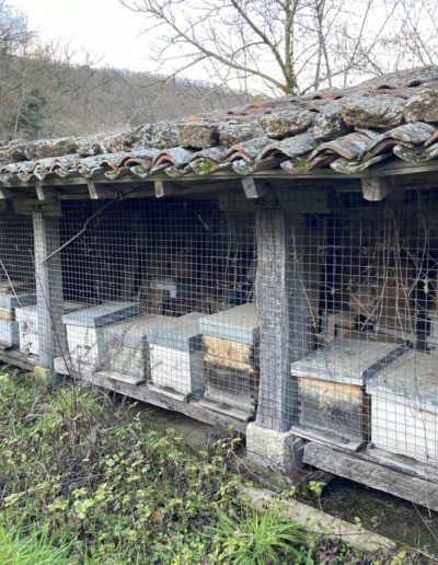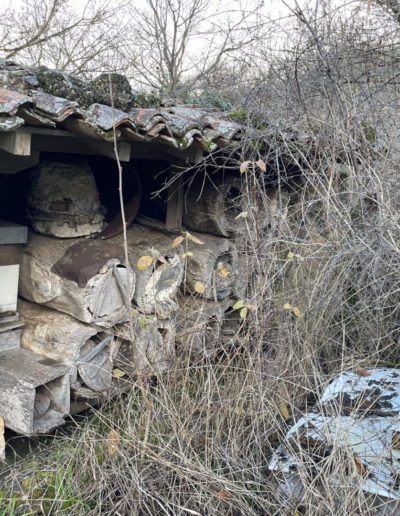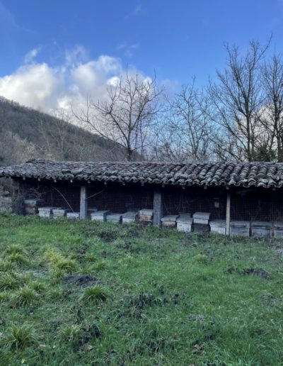 Descripción: Se trata de una construcción para albergar colmenas, una tejavana donde principalmente cuenta una altura a dos aguas y entramado de madera, en los huecos dejados para las colmenas, los Dujos o troncos se agolpan unos encima de otro, sin más apoyo que uno de otro, en este caso, lo que podemos observar, es un colmenar de los típicos que hemos encontrado en la localidad, pero en este caso sigue en uso y mezcla parte de colmenas ya modernas en cajones, con una parte todavía de troncos o Dujos apilados en una de las zonas, donde ya no se hace utilización del mismo.