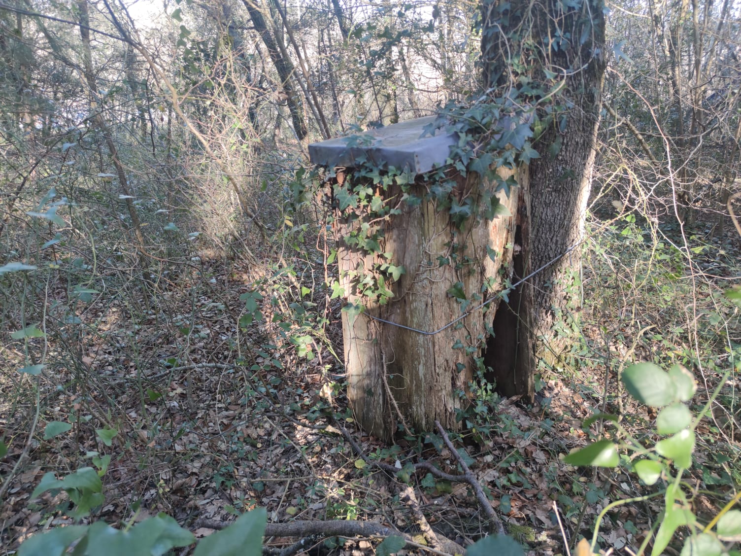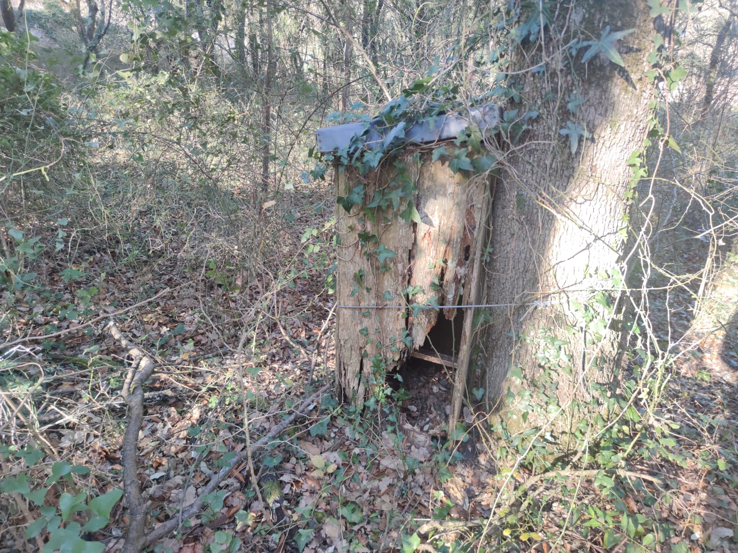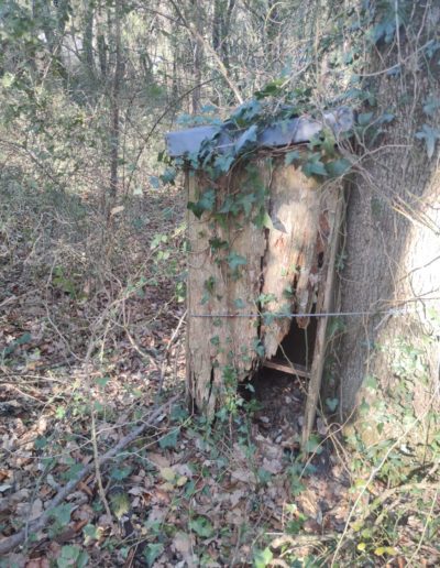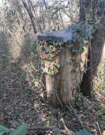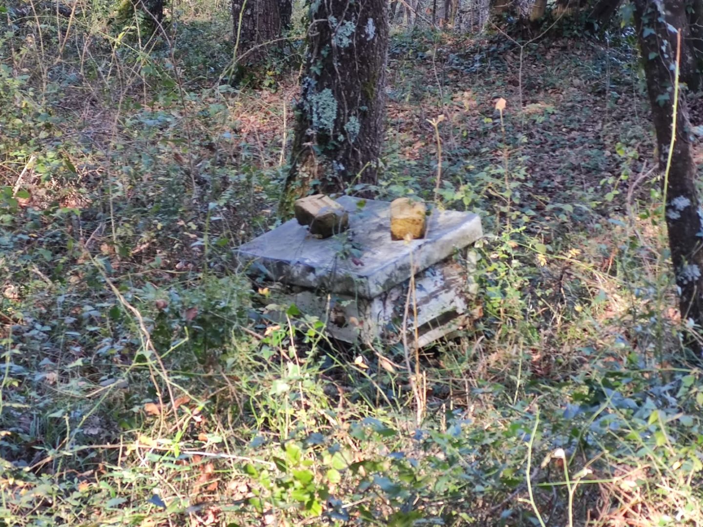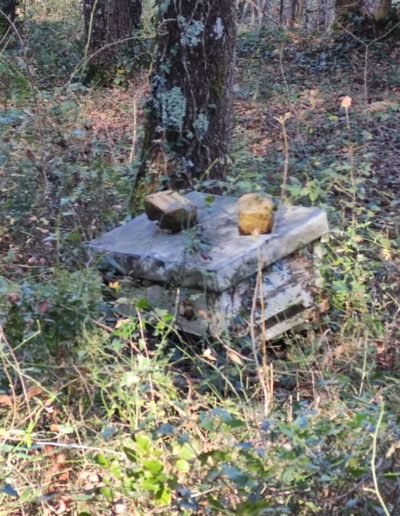 Descripción: Se trata de un colmenar antiguo o de los que se han usado toda la vida, que se ha ido dejando perder, está en un pequeño bosque al lado del cementerio en la parte alta del pueblo de Cadagua, aquí se han incluido colmenas de diferentes tipos y actualmente hemos encontrado 3 o partes de ellas, los mayores de la localidad me confirman que allí se ha utilizado como colmenar por una de las familias locales.