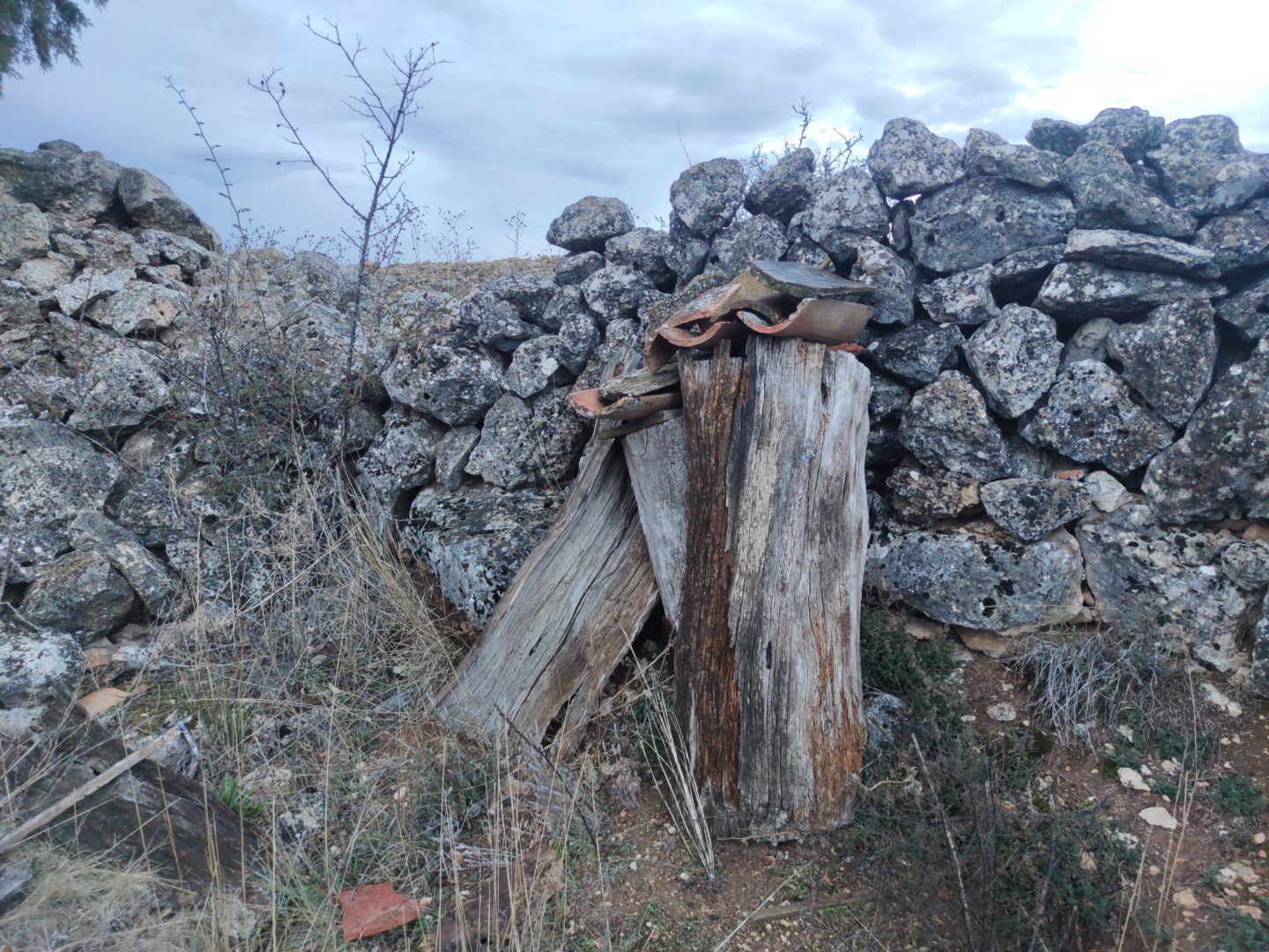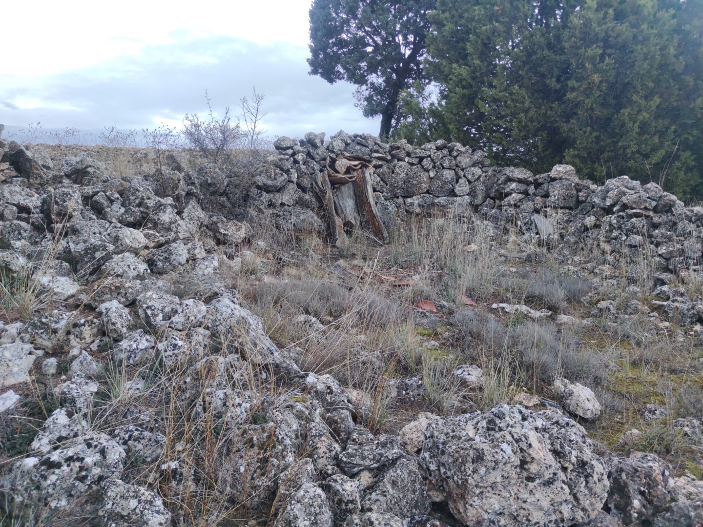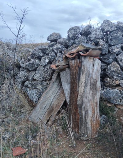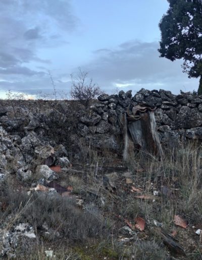 Descripción: Se trata de un pequeño colmenar pegado a tierras de cultivo, con un pequeño muro perimetral, que se encuentra en malas condiciones, bastante caído, aunque es uno de los que prevén recuperarse en el tiempo.