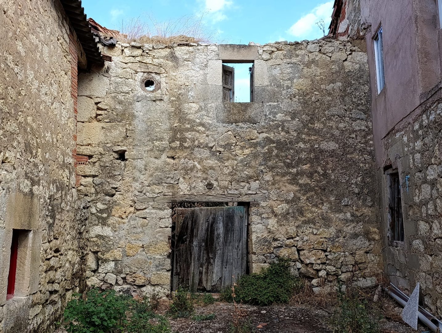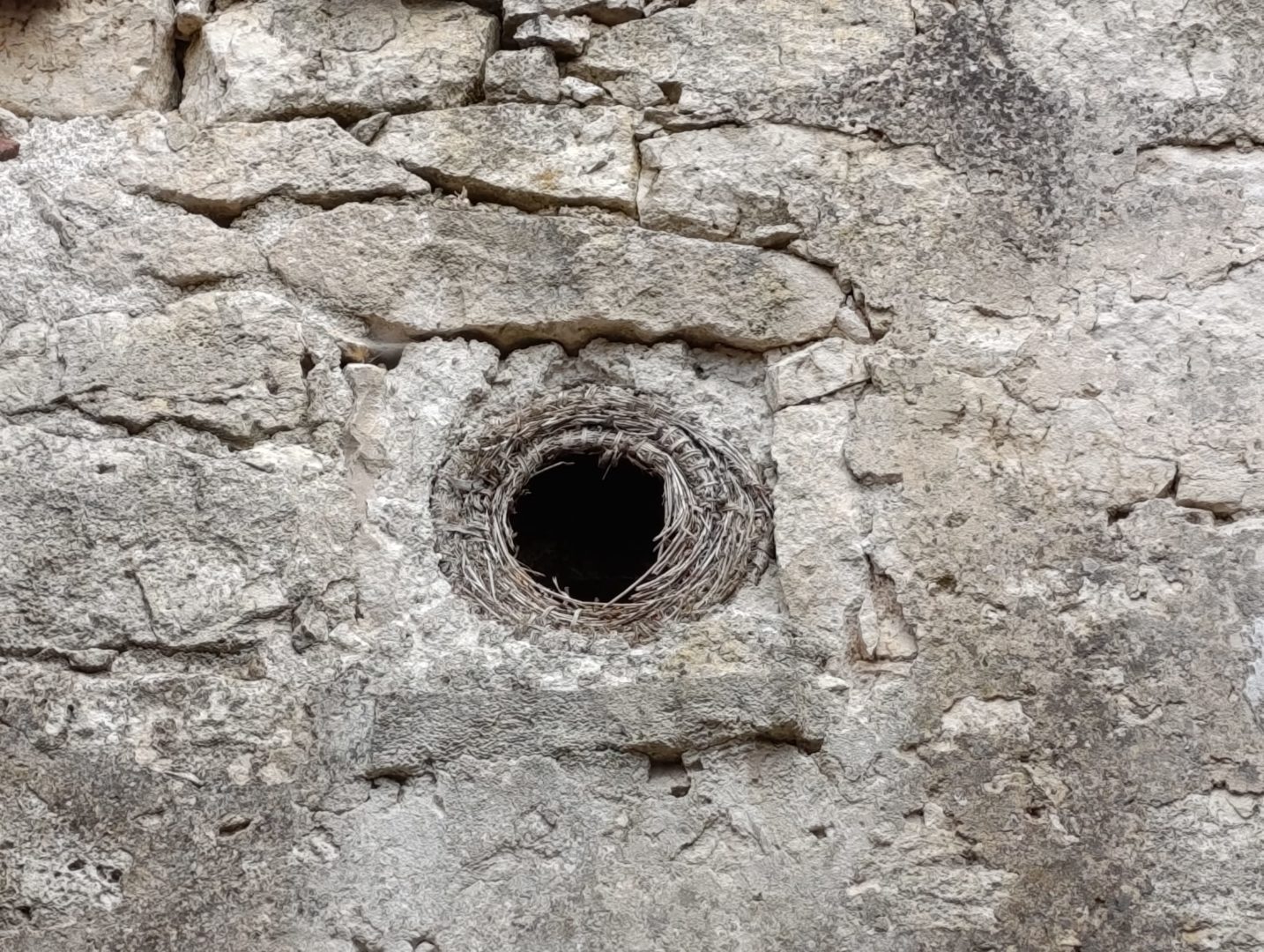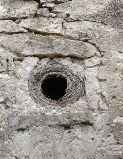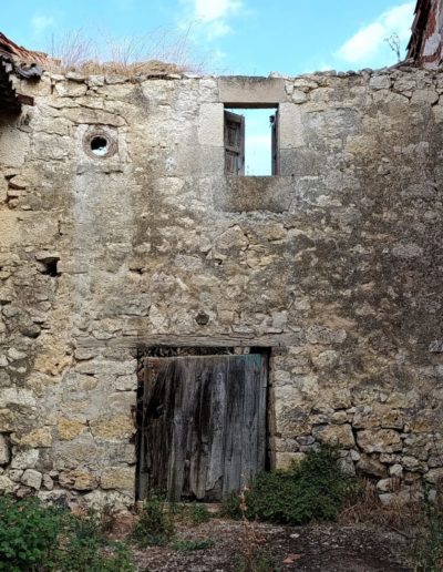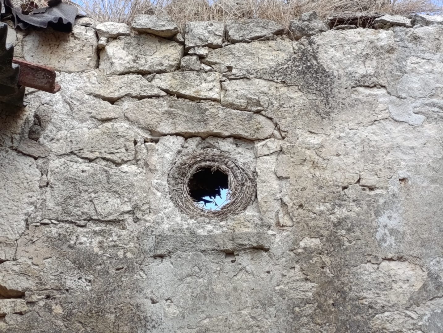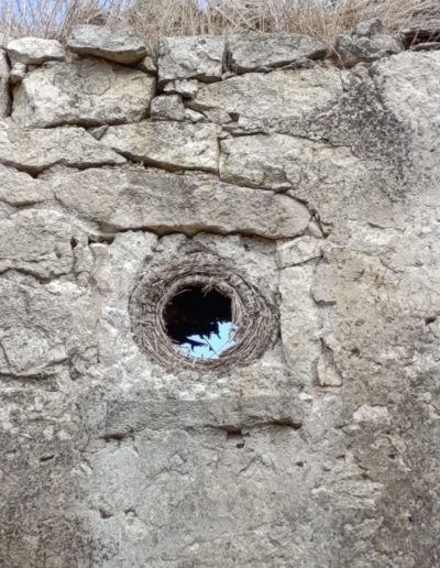 Descripción: Se trata de una antigua colmena en el alto de una vivienda, en este caso es un cesto, ya que se observa que está hecha con mimbre, al menos el resto de lo que queda, la casa esta en ruinas y solo se observa un poco de lo que queda de esa colmena.