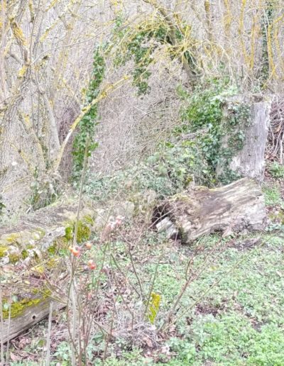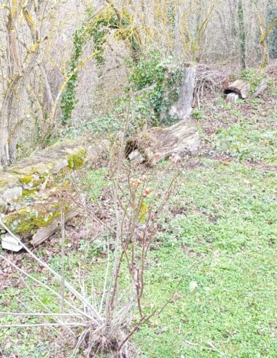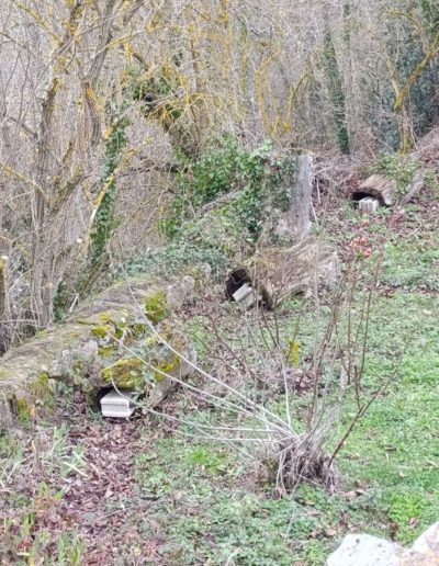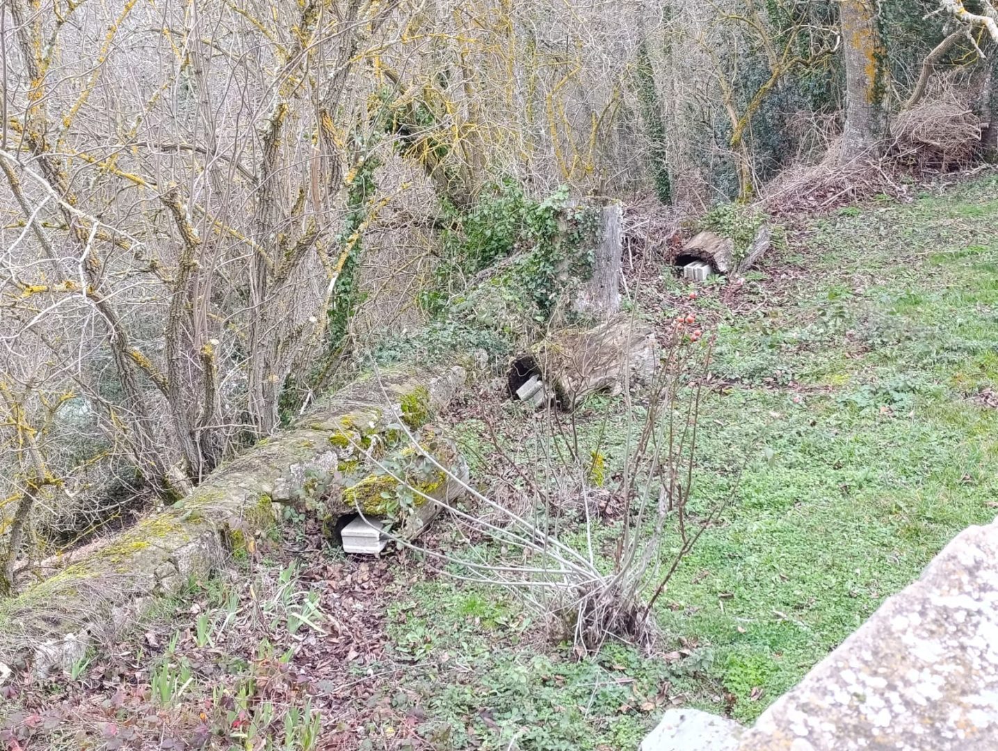 Descripción: Encontramos cuatro dujos en un terreno junto al lavadero; estos dujos se han abandonado y por no retirarlos y evitar que entren abejas, se han metido unos ladrillos tabiqueros de hormigón