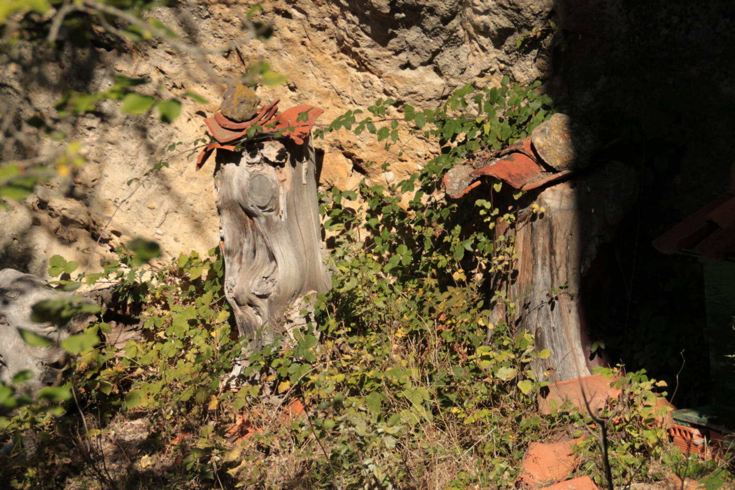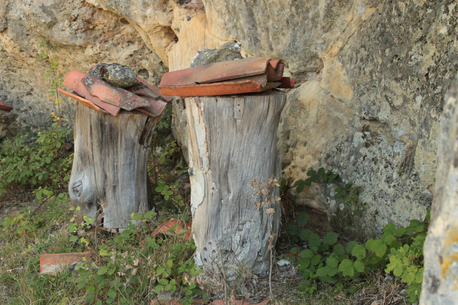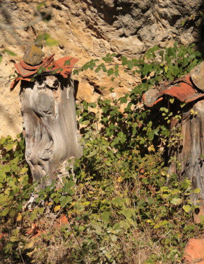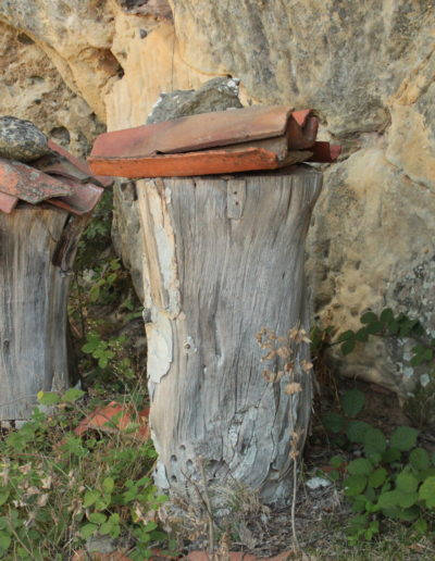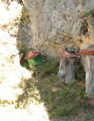 Descripción: Colmenas tradicionales bajo roca, en una peña cercana a la localidad de Gete, en Pinilla de los Barruecos. Hay además una colmena moderna.