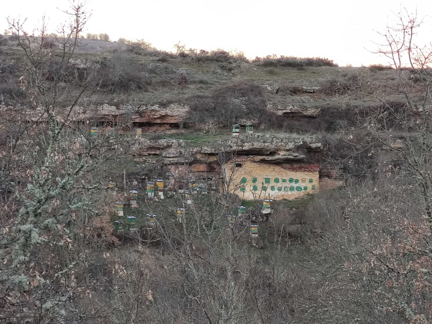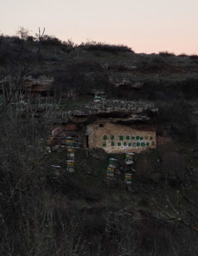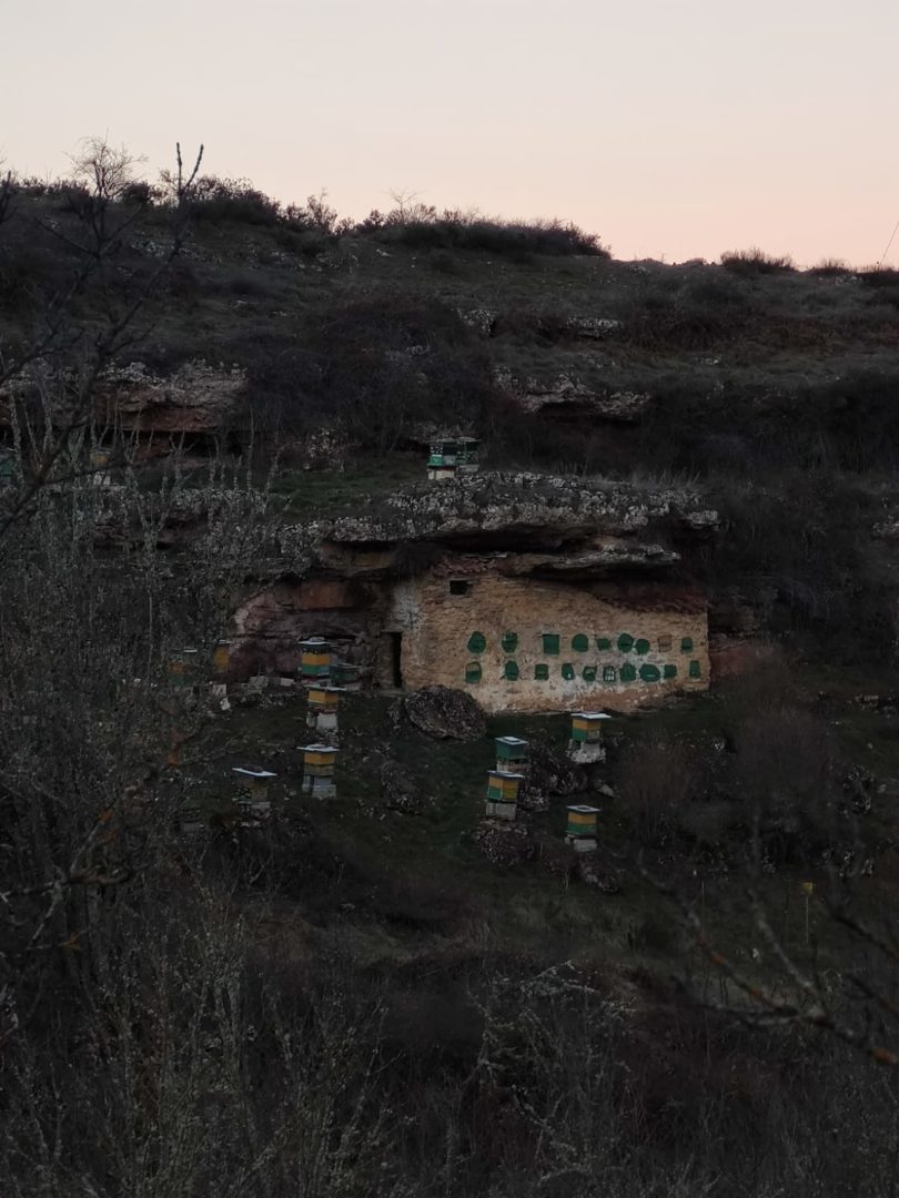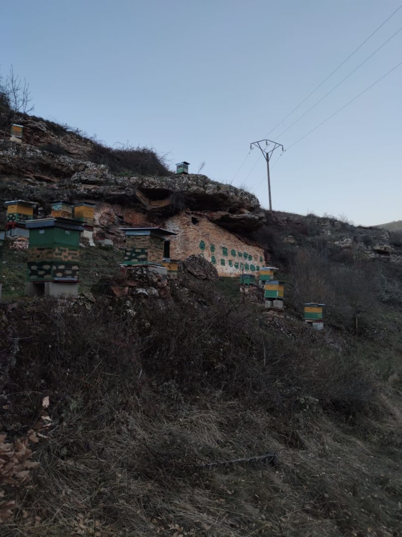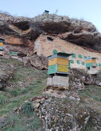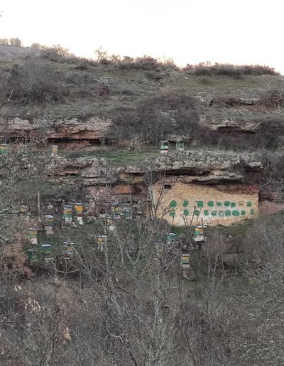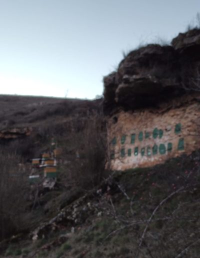 Descripción: Colmenar en uso y funcionamiento, con bastantes colmenar modernas, colocadas por toda la parcela, se puede apreciar que durante mucho tiempo ha sido un lugar muy utilizado para este uso, cambiando la utilización de los Dujos de pie, por las colmenas modernas, aun así, cabe destacar la hornillera enclavada en la roca, que es muy destacable, aunque el vallado impide acercarse más para poder observarlo con claridad, en la zona, hay algunos lugares, donde podría haber albergado muchas más colmenas, por los muros terrazas que existen.