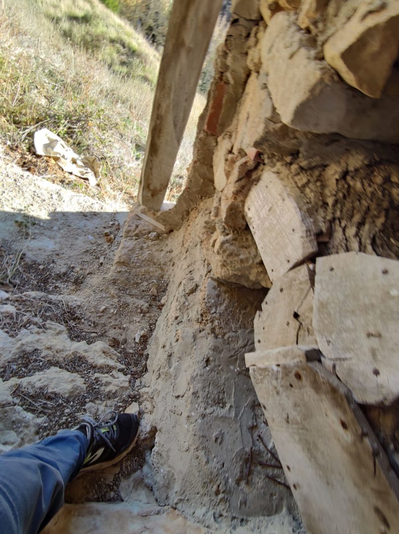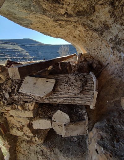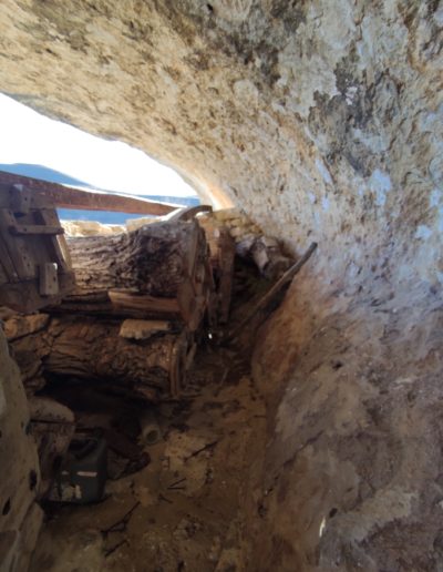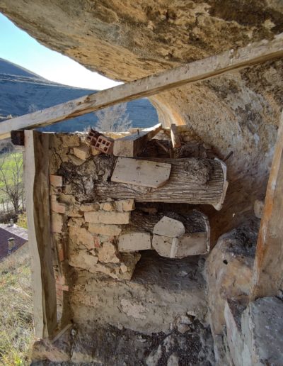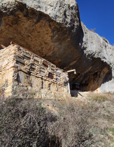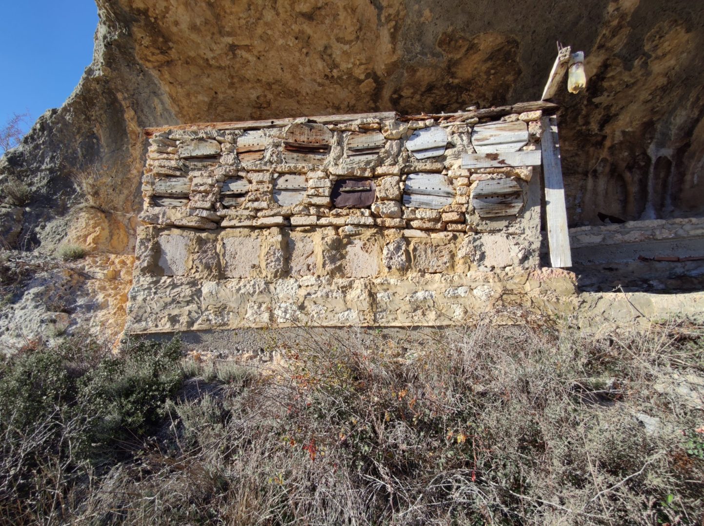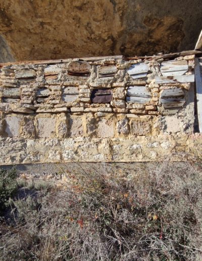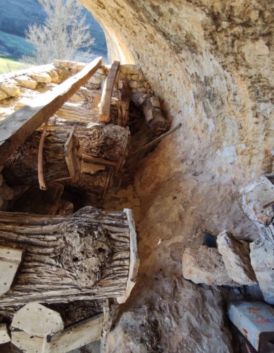 Descripción: Se trata de una hornillera bajo el abrigo de una roca, en una zona de dificil acceso. La hornillera parece estar explotada aunque en el momento de visitarla no parece tener abejas alrededor, eso sí, vemos un trampeo para avispón asiatico. La hornillera esta compuesta de Dujos tumbados en buen estado y alguna colmena moderna cercana fuera de la hornillera. La construcción parece haberse realizado con piedras cercanas, por como es el tipo de laja cortada y deja abierto el techo lo que muestra fácilmente los hornillos.