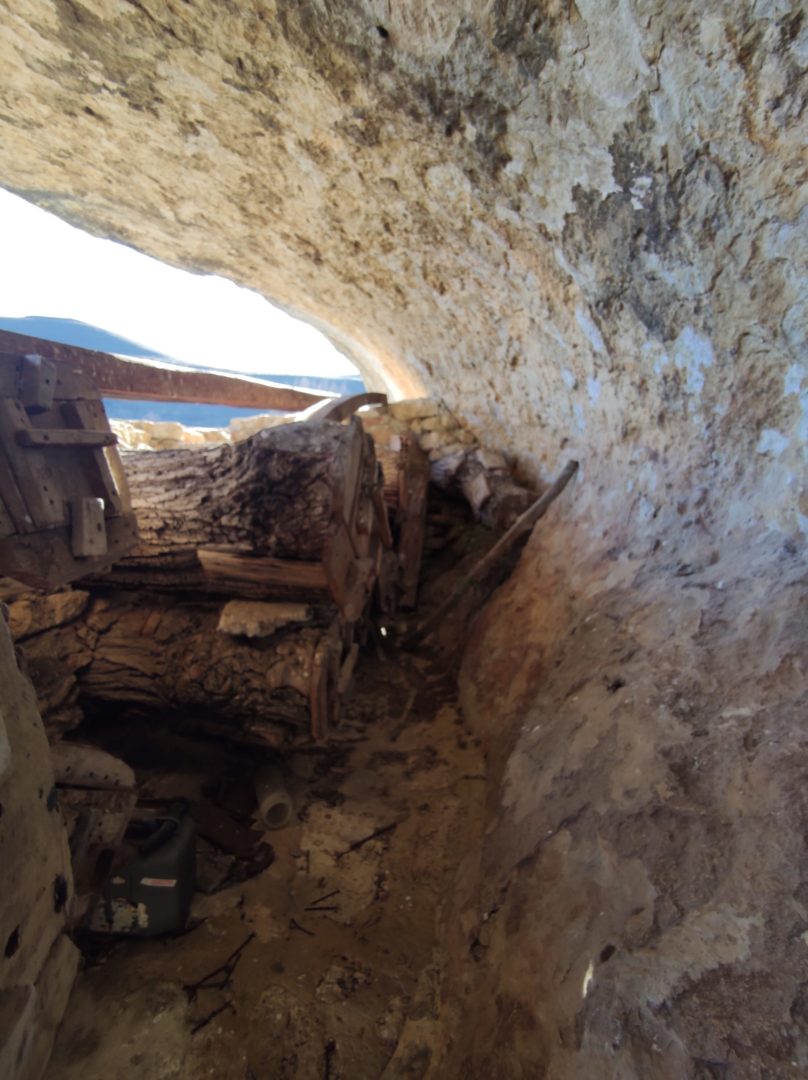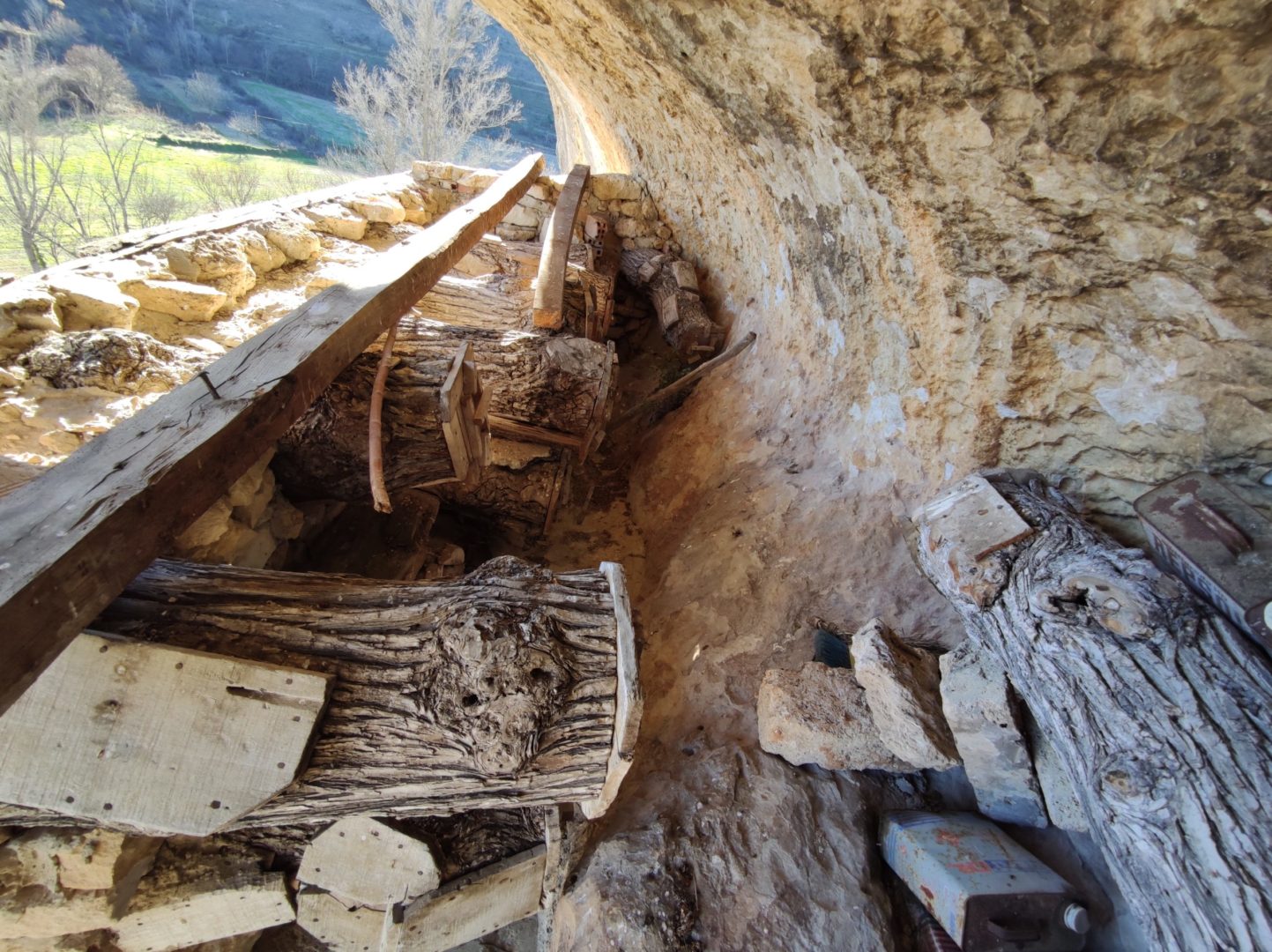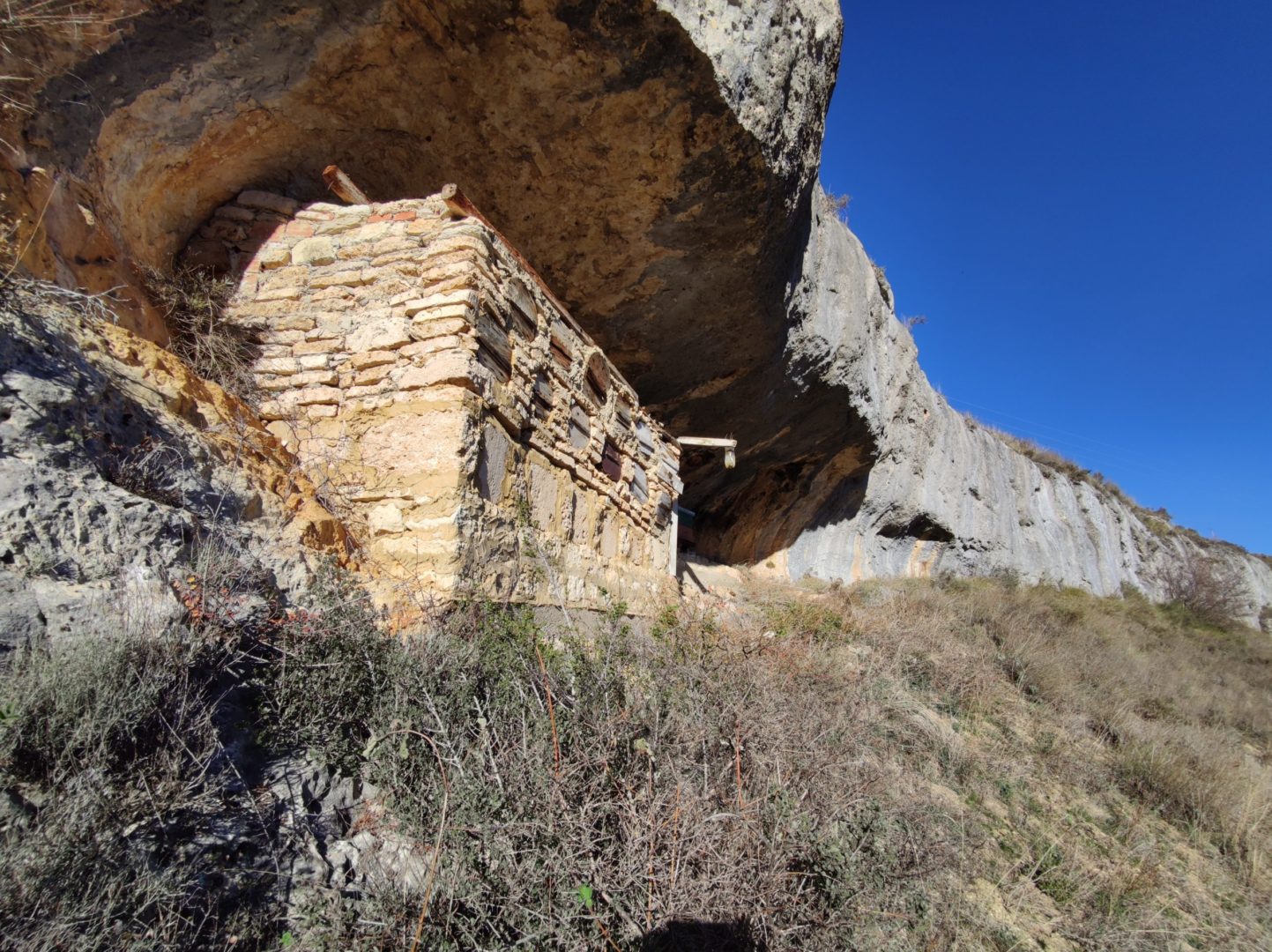 Descripción: Se trata de una hornillera bajo el abrigo de una roca, en una zona de dificil acceso. La hornillera parece estar explotada aunque en el momento de visitarla no parece tener abejas alrededor, eso sí, vemos un trampeo para avispón asiatico. La hornillera esta compuesta de Dujos tumbados en buen estado y alguna colmena moderna cercana fuera de la hornillera. La construcción parece haberse realizado con piedras cercanas, por como es el tipo de laja cortada y deja abierto el techo lo que muestra fácilmente los hornillos.
