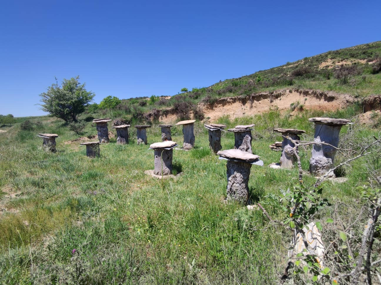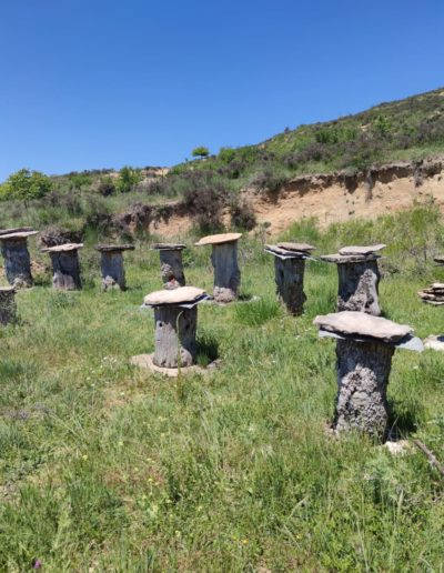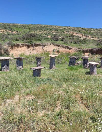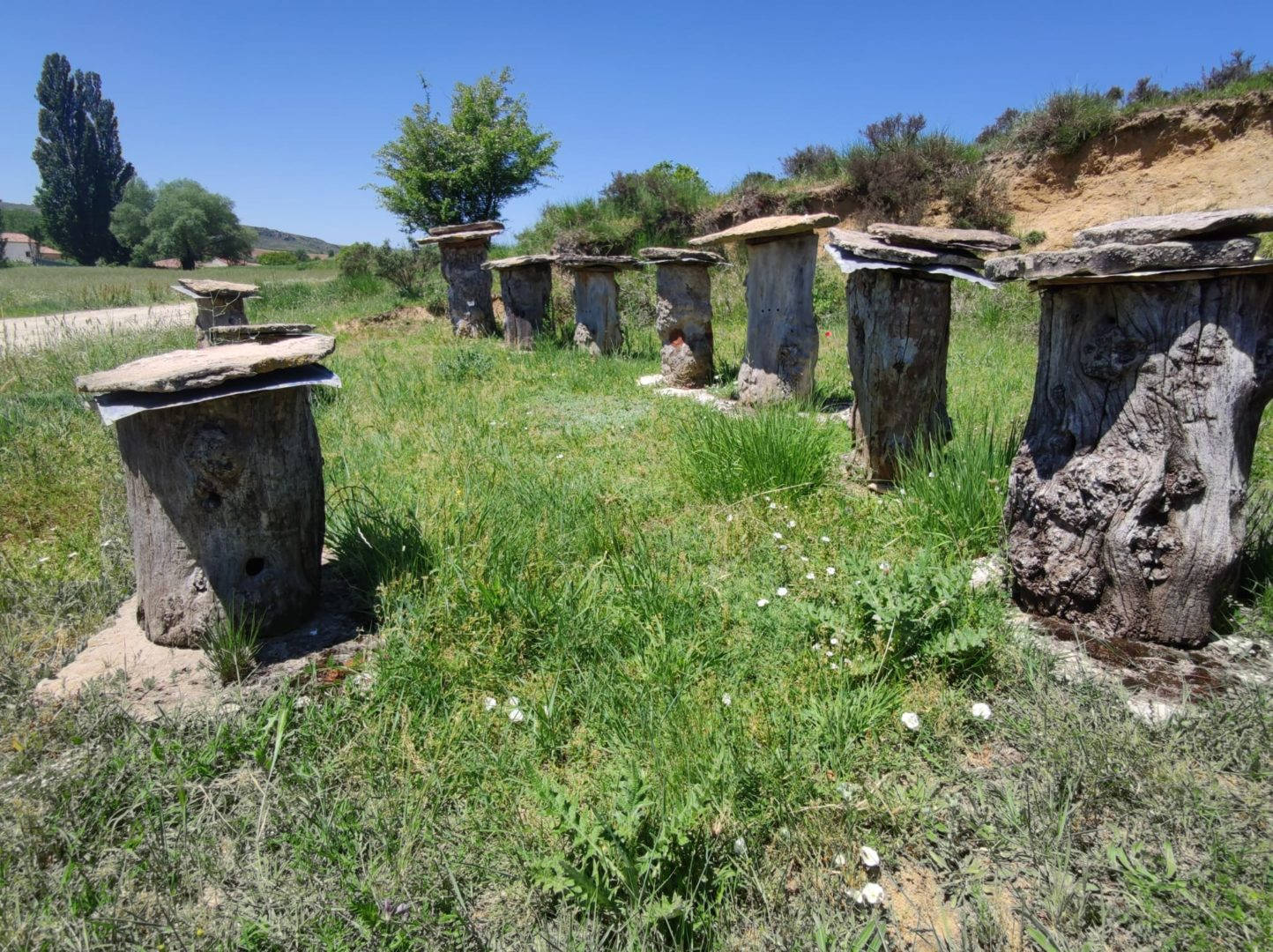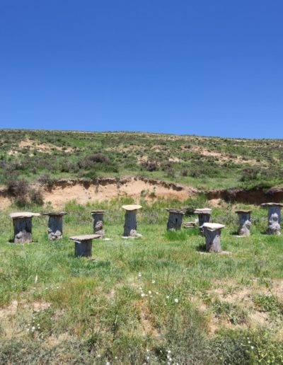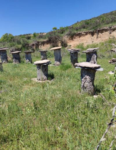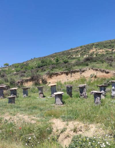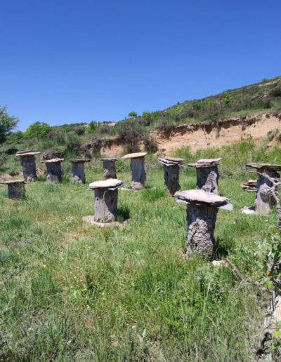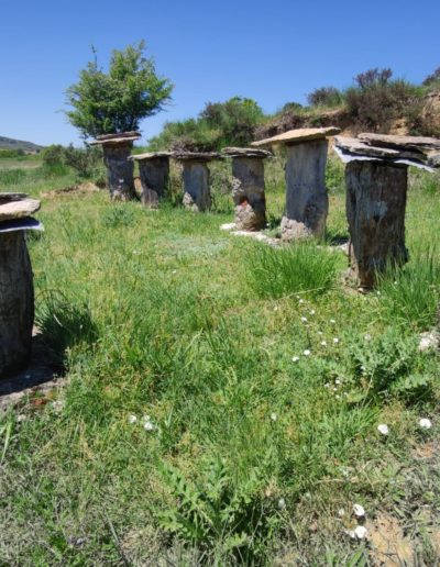 Descripción: Nos encontramos con un ejemplo visitable de colmenar tradicional, pienso y por lo que me comentan en la zona, este colmenar nace como pequeño museo a la apicultura tradicional, posiblemente aprovechando un desmonte de la ladera, para el camino que transita hasta la nave ganadera, se ha instalado una serie de Dujos antiguos, con su bases de piedra y losas de piedra, que sin duda merece la pena visitar. en un lateral hay una placa en barro, que pone Museo, pero no por ello cabe destacar el cuidado y respeto que se ha tenido.